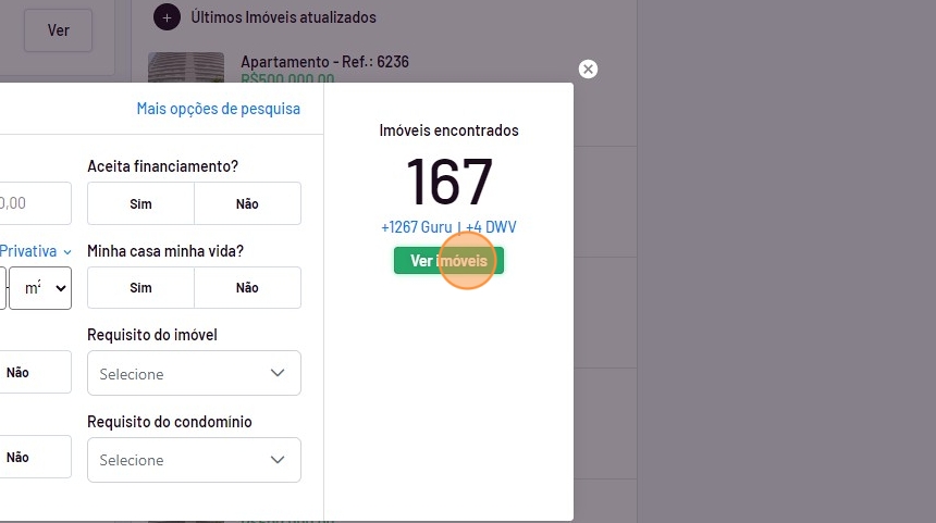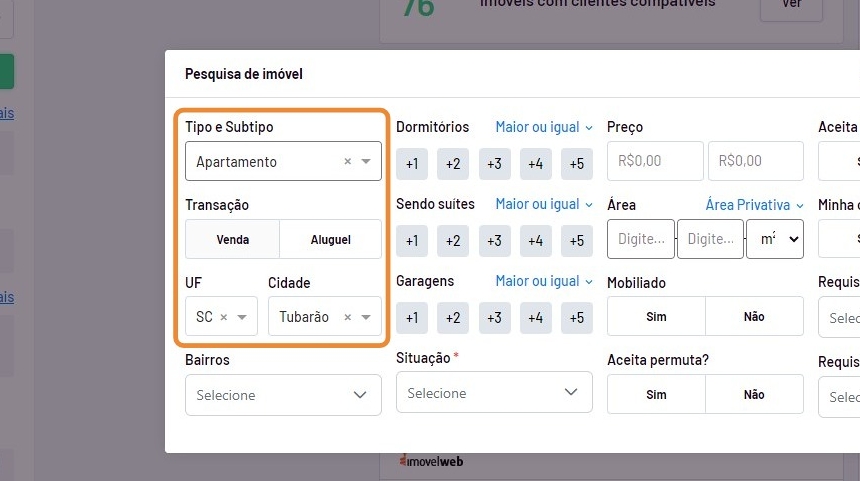 - Obrigatoriamente você deve preencher: Tipo/Subtipo, Transação, UF e Cidade para que seja possível filtrar por imóveis da DWV.