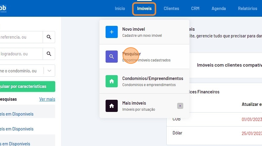 - Passe o mouse sobre o menu "Imóveis" e clique em "Pesquisar".