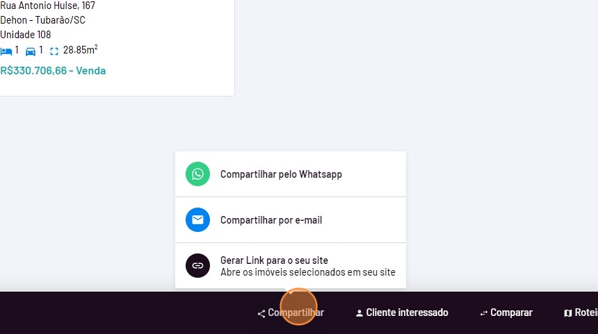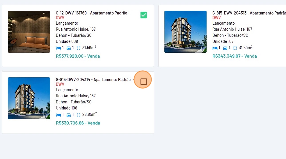 - Selecione os imóveis desejados clicando na caixinha de seleção do canto superior direito do imóvel.