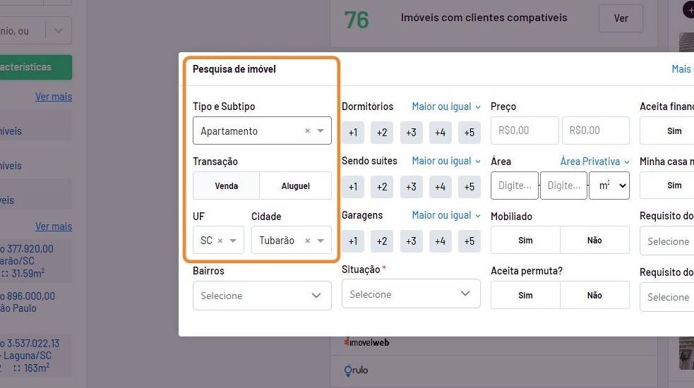 - Para pesquisar por imóveis de bases de dados externas (como Órulo e DWV), será necessários preencher OBRIGATÓRIAMENTE: Tipo/Subtipo, Transação, UF e Cidade.
