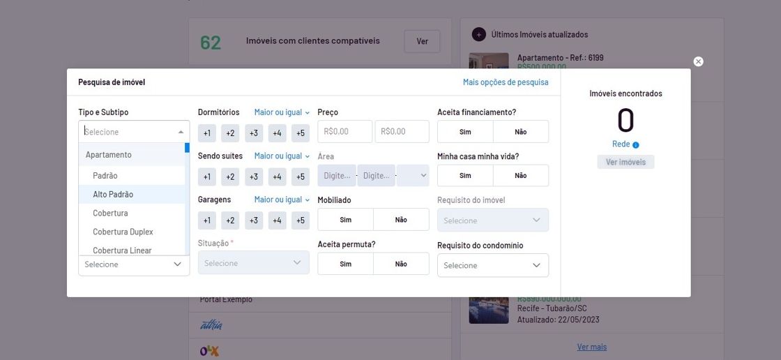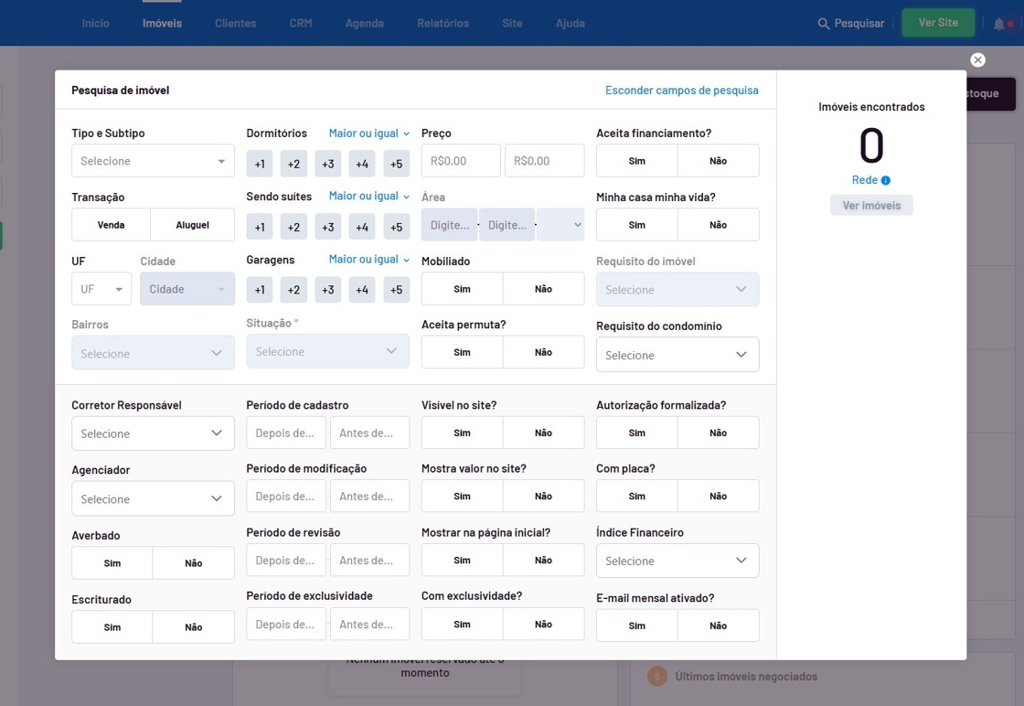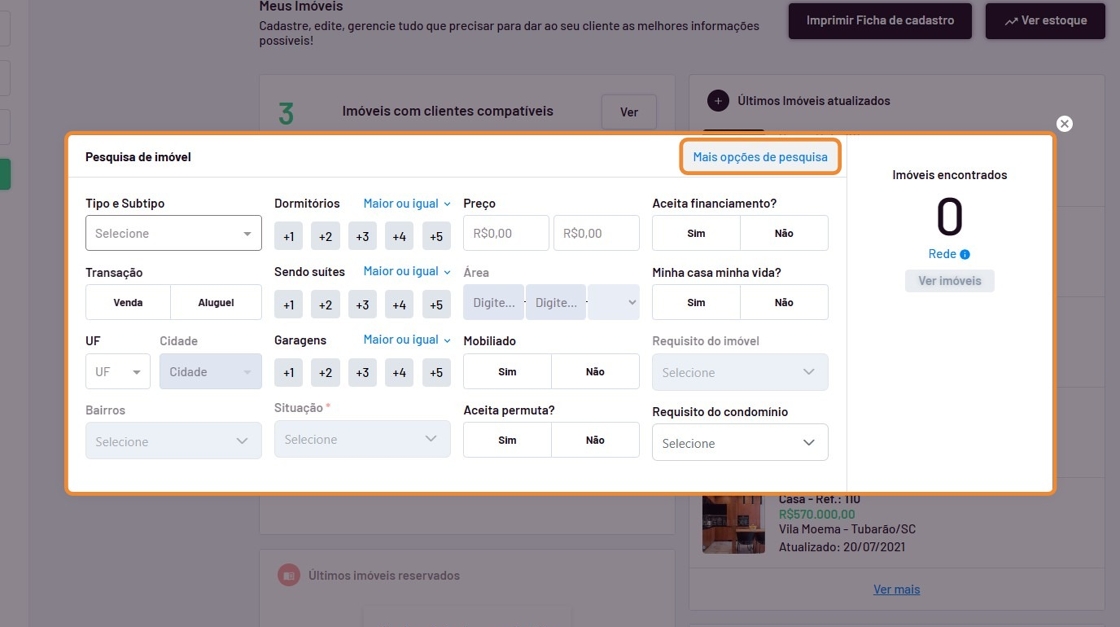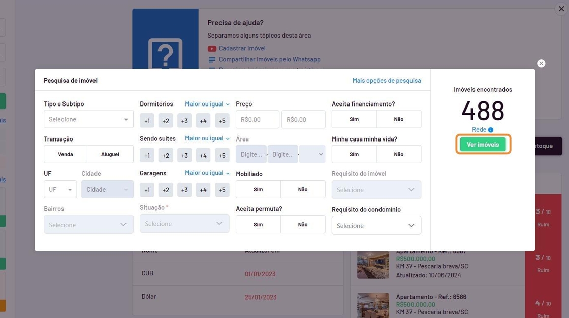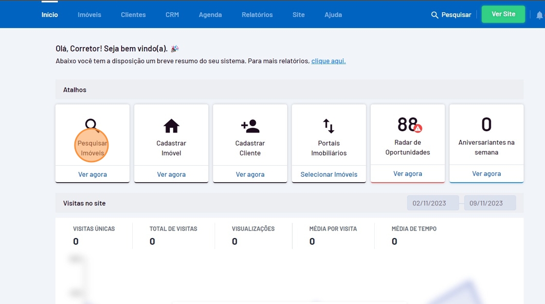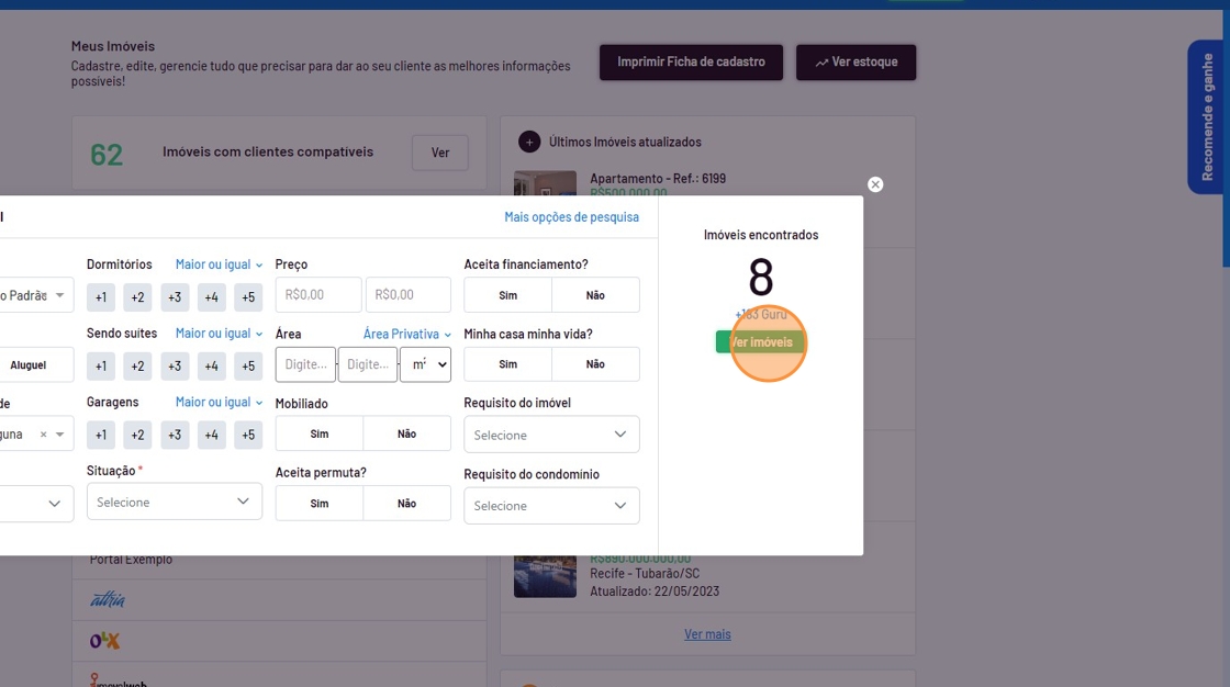 - Na área de pesquisa irá mostrar o total de imóveis que você possui sem selecionar nenhum filtro. Para visualizar todos os imóveis, basta clicar em "Ver imóveis".