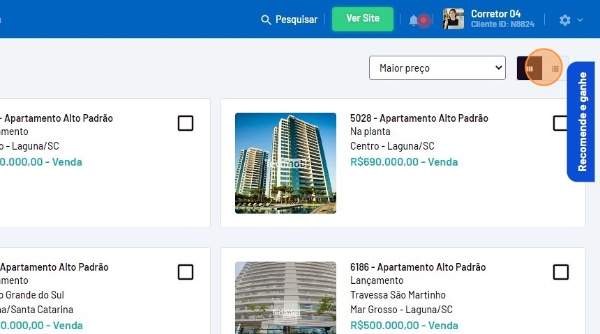 - Clicando no botão no canto superior direito você pode alterar o modo de visualização dos imóveis entre cards e listas.