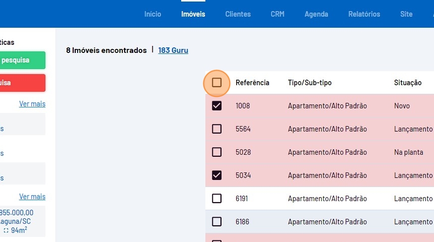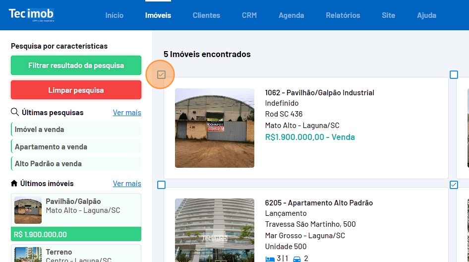 - No formato de lista é possível selecionar todos os imóveis ao mesmo tempo, clicando sobre a primeira caixinha de seleção do topo ou selecionar individualmente cada um dos imóveis.