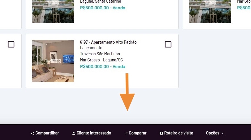 - No formato de cards você pode clicar sobre a imagem do imóvel ou marcar os imóveis desejados clicando na caixinha de seleção no canto superior esquerdo de cada imóvel.