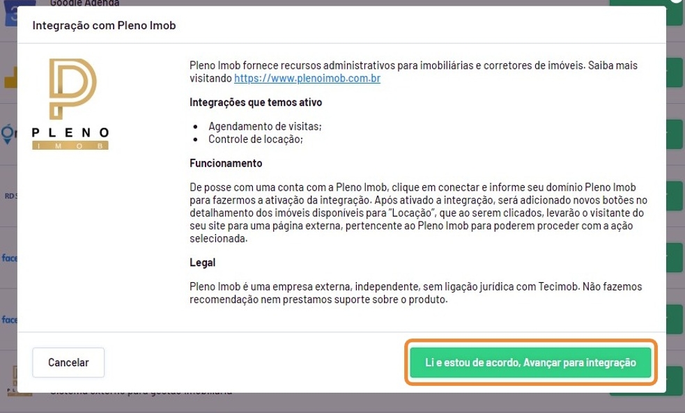 Clique em "Li e estou de acordo, avançar para integração" para conexão.