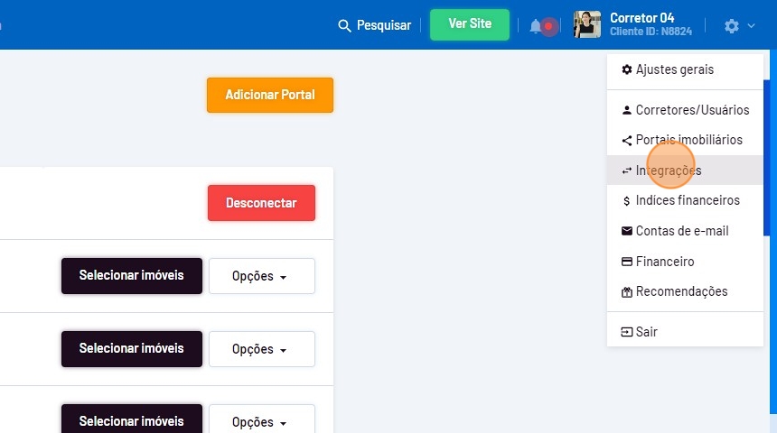 - Passe o mouse sobre a engrenagem no canto superior direito da sua tela e clique em "Integrações".