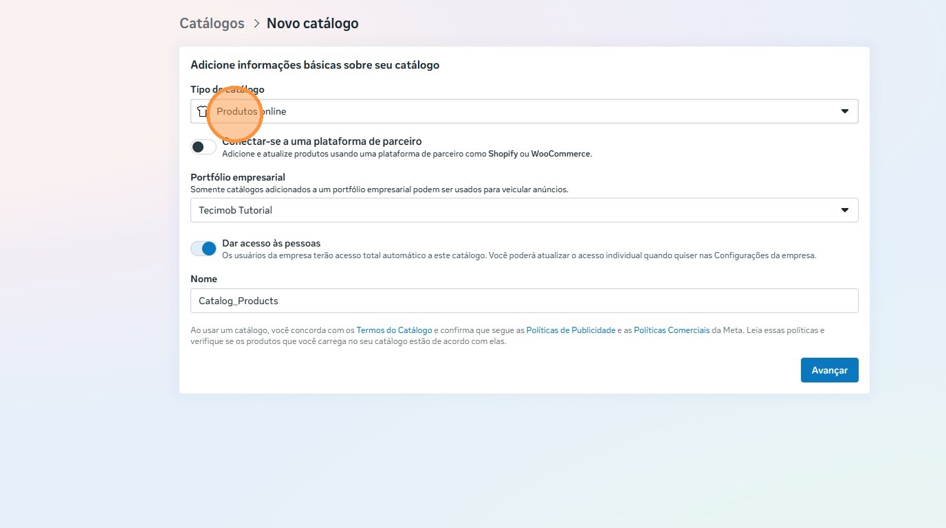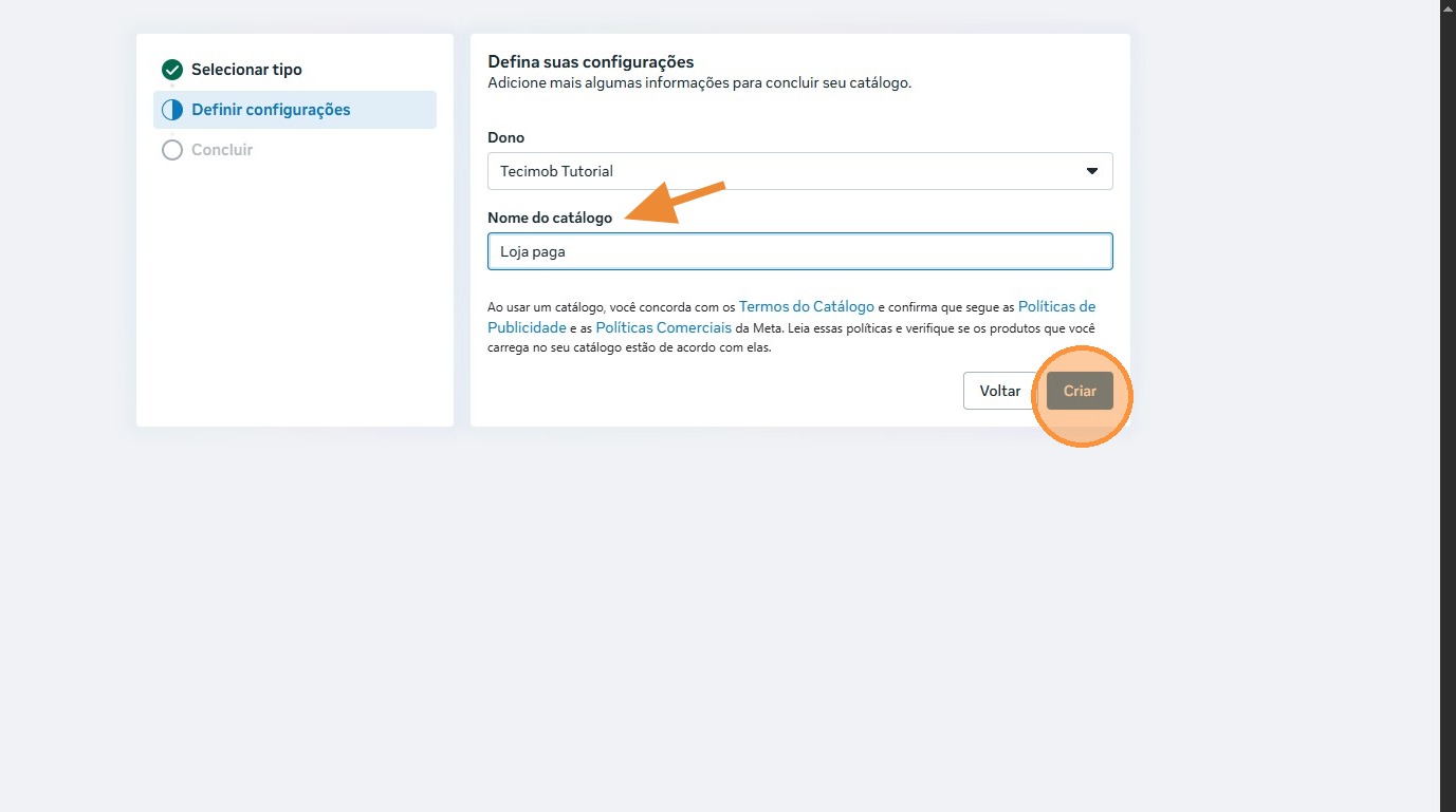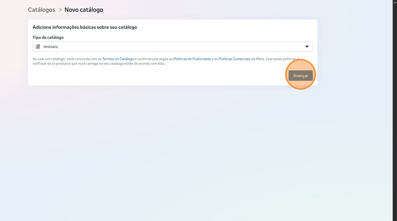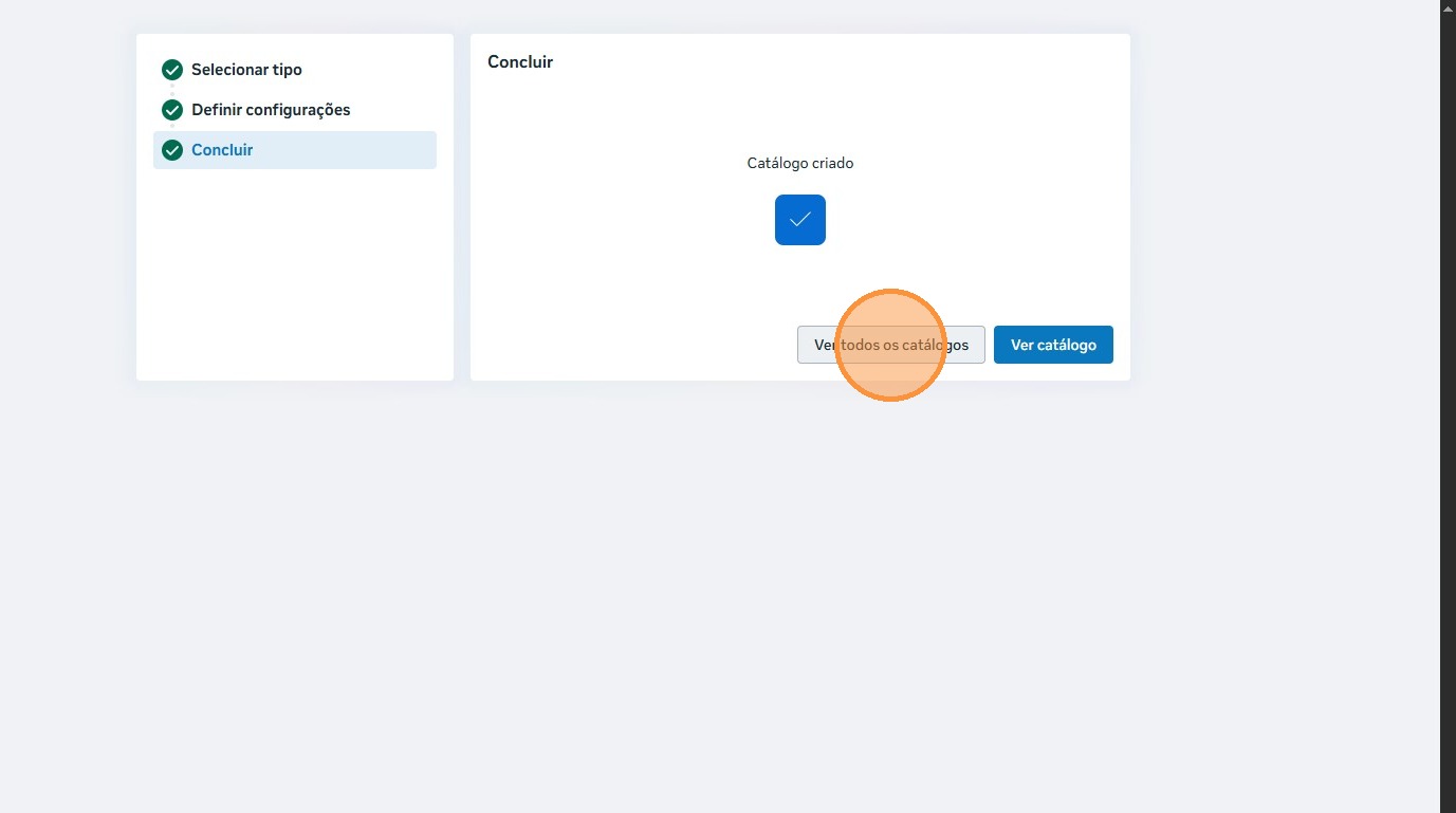 Esse procedimento inicial é obrigatório aos clientes que ainda não possuem nenhum catálogo criado. Após finalizar a criação desse catálogo pago, poderemos seguir com a criação do catálogo real.
