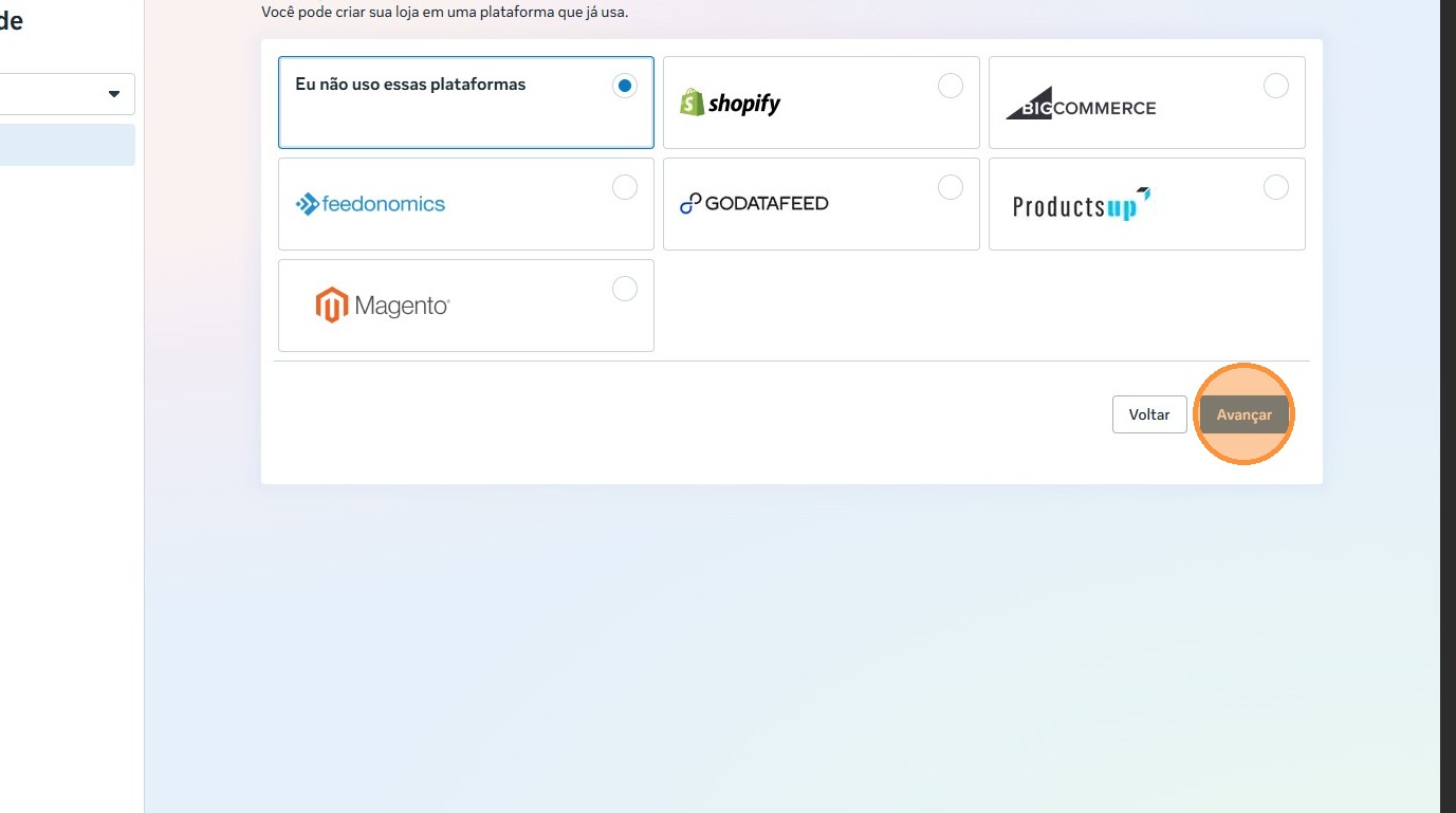 - Selecione a opção "Eu não uso essas plataformas" e clique em "Avançar".