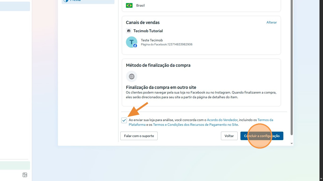 Ao final da página, selecione a caixa de seleção para aceitar o "Acordo do Vendedor" do Facebook.