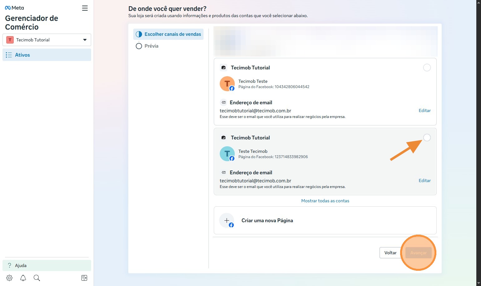 - Escolha a página onde será criada a loja e clique em "Avançar"