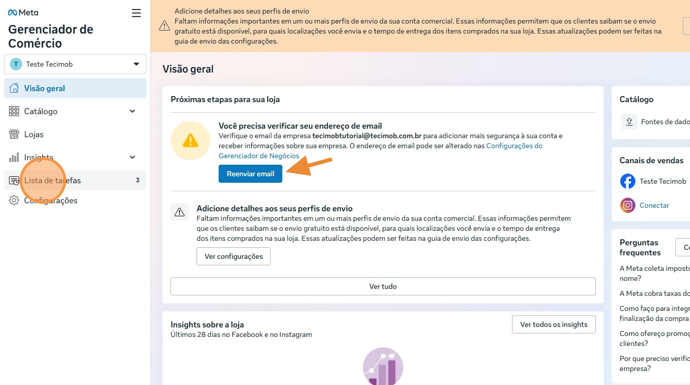 - Acesse a área da Lista de Tarefas, verifique o seu e-mail e no campo Fornecer Informações da Empresa clique em começar, e preencha o formulário com os dados para a equipe do Meta fazer a verificação da sua conta.