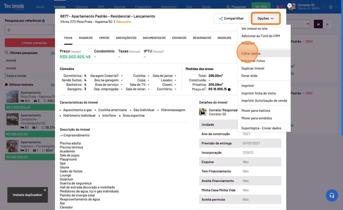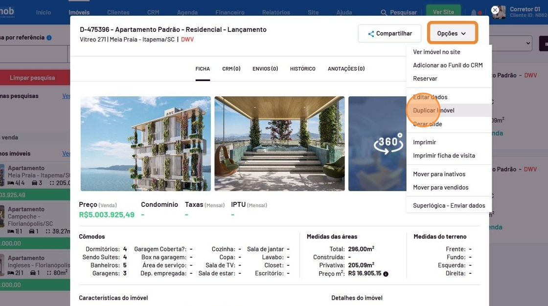 - Vá em "Opções" e clique em "Duplicar Imóvel".