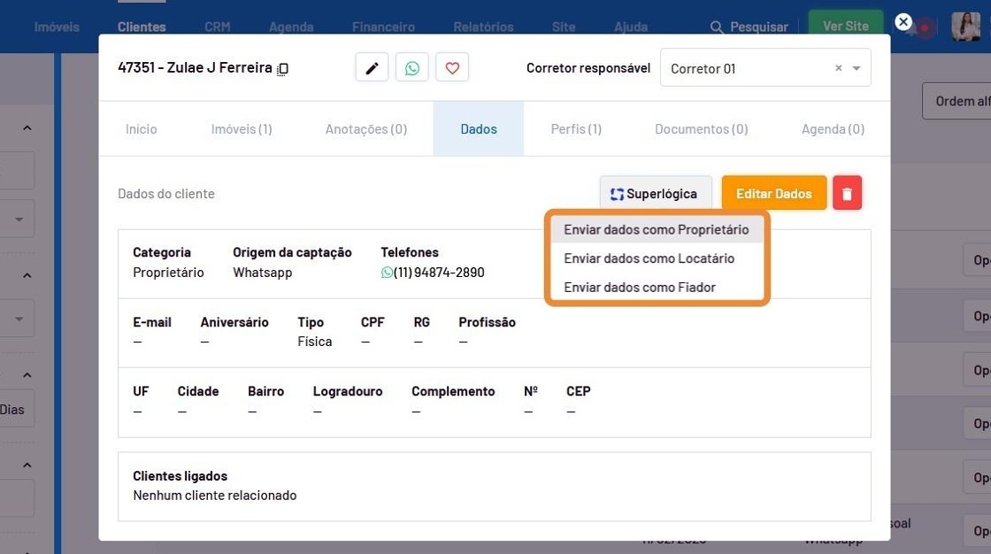 Após conectar com a Superlógica, será ativado as opções de envio de dados do cliente em seu sistema, siga estes passos para conferir: