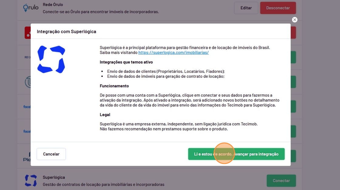 Clique em "Li e estou de acordo, avançar para integração" para conexão.