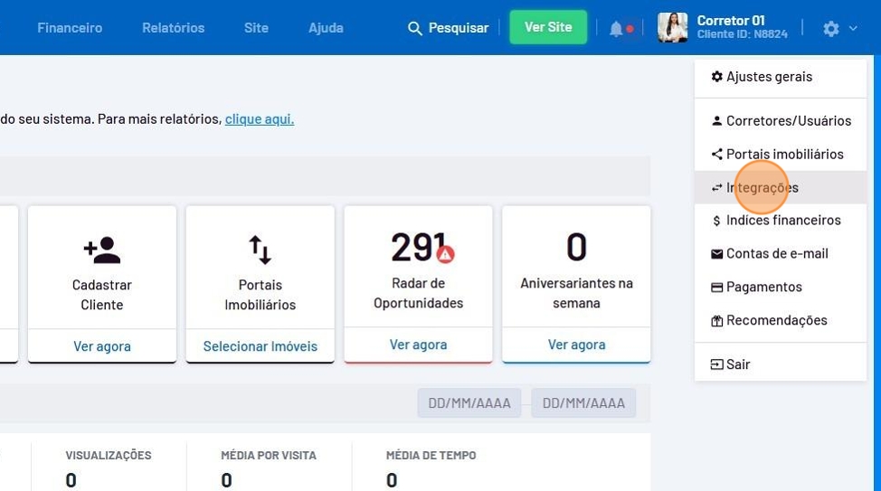 - Passe o mouse sobre a engrenagem no canto superior direito da sua tela e clique em "Integrações".