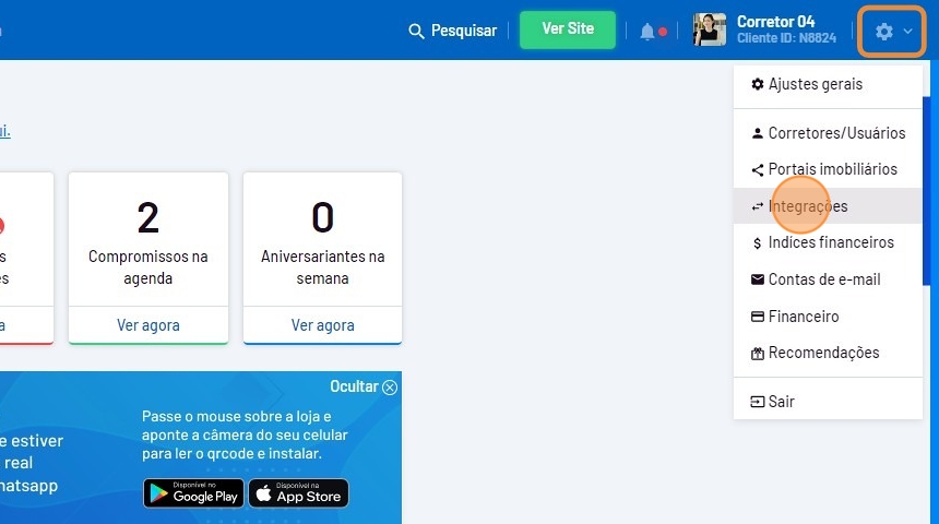 - Passe o mouse sobre a engrenagem no canto superior direito da sua tela e clique em "Integrações".