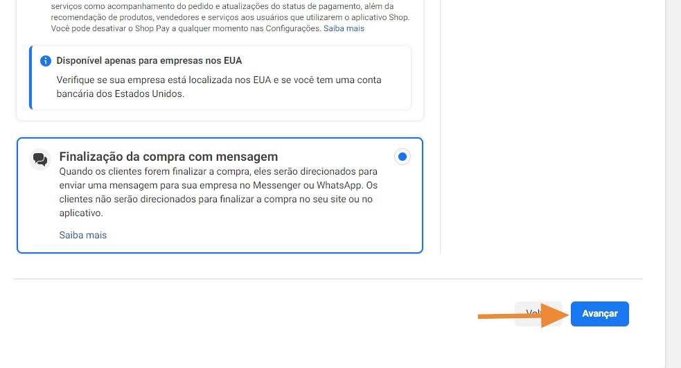 - Selecione "Finalização da compra com mensagem", e clique em "Avançar".