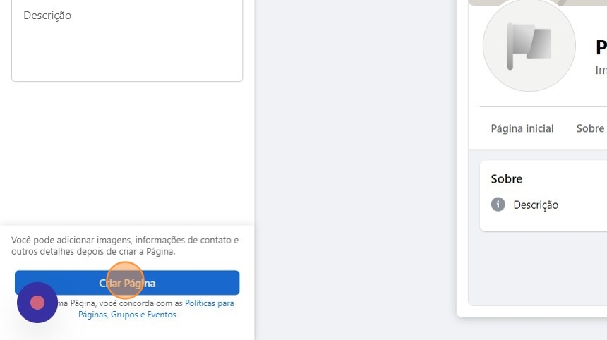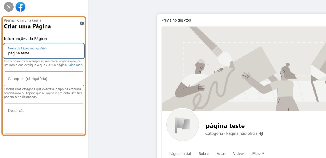 - Preencha o campo "Nome da página", selecione as categorias e faça uma breve descrição da empresa.