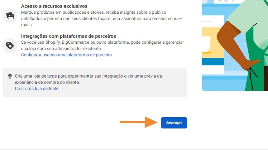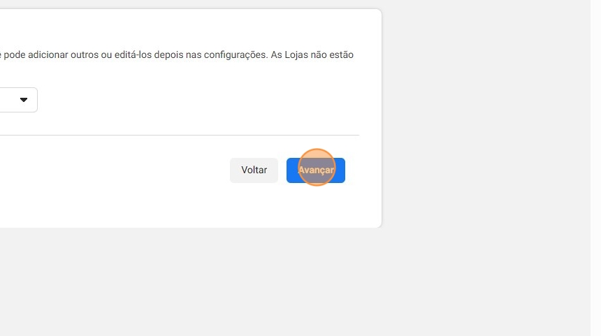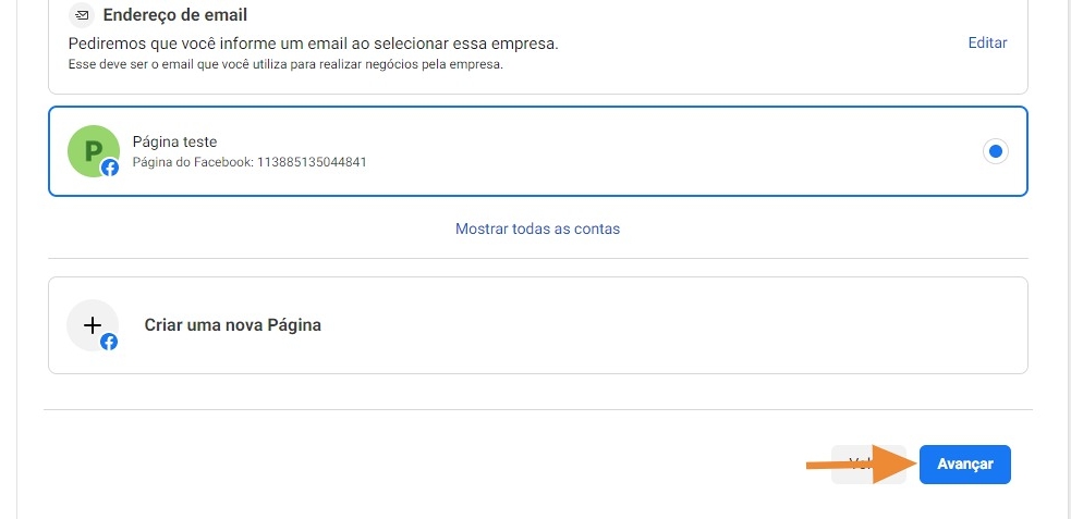 - Escolha a página onde será criada a loja e clique em "Avançar".
