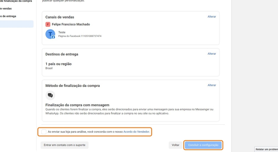Ao final da página, clique na caixinha de seleção para aceitar o "Acordo do Vendedor" do Facebook.