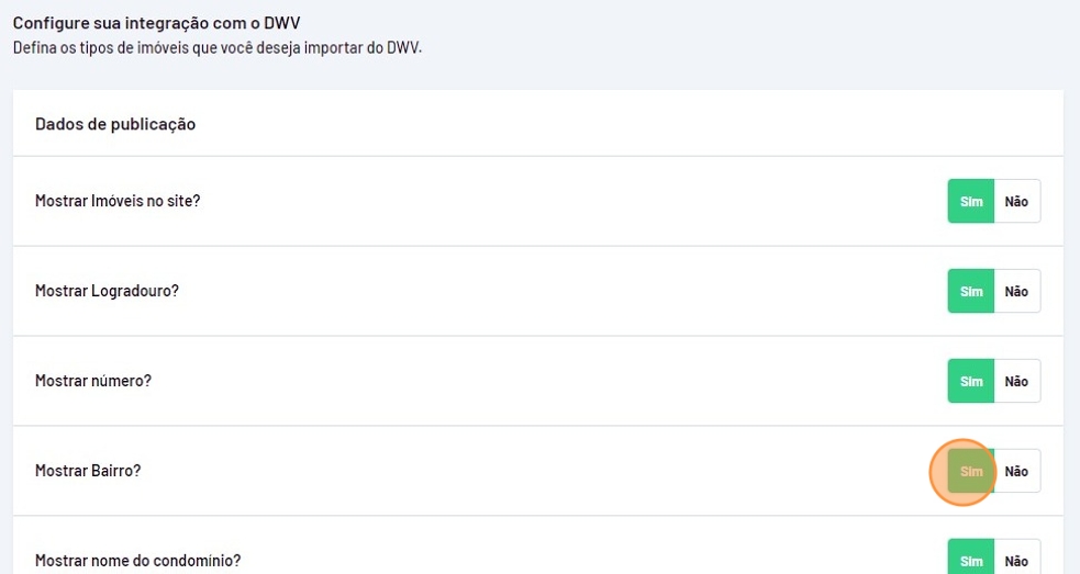- Defina quais dados da localização dos imóveis que serão importados da DWV irão aparecer em seu site.