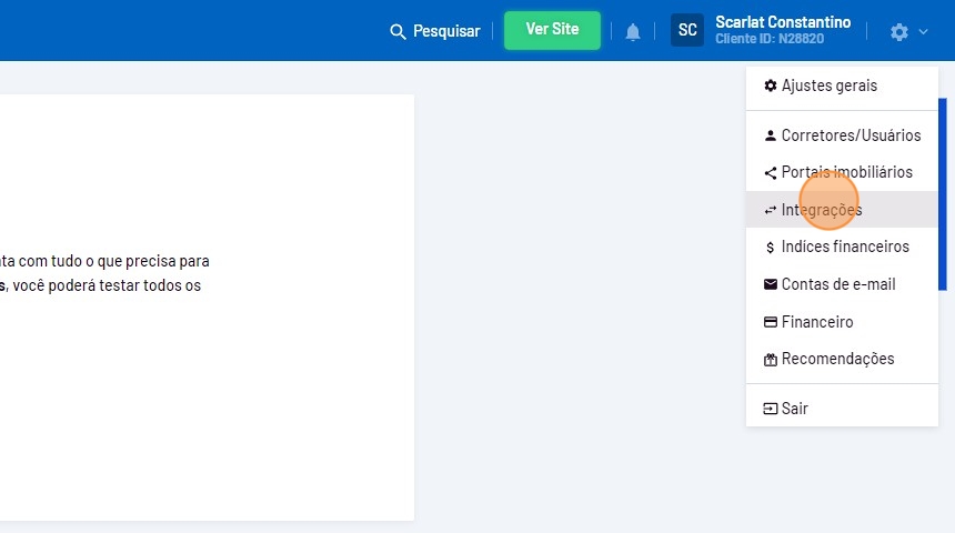- Passe o mouse sobre a engrenagem no canto superior direito da sua tela e clique em "Integrações".