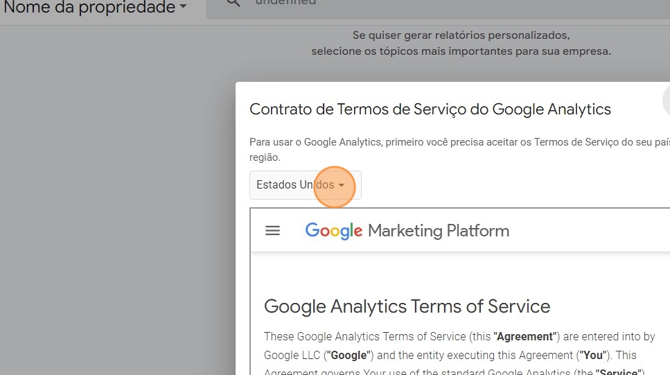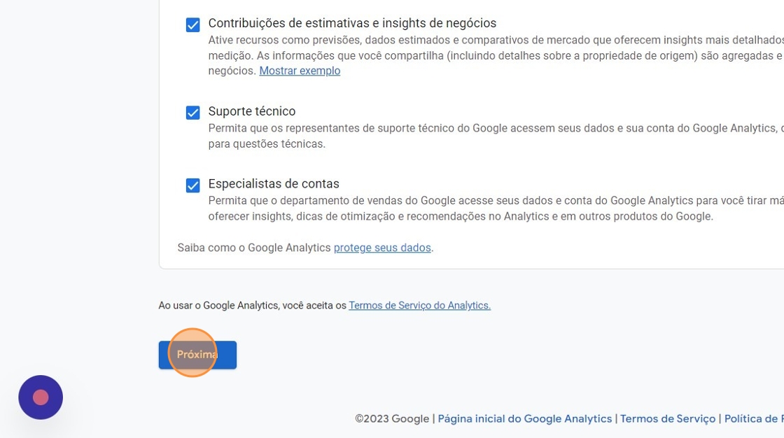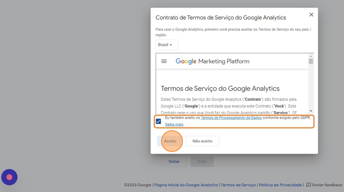 - Selecione a caixinha de seleção para declarar que aceita os "Termos de Processamento de Dados" da Google e clique em "Aceito".