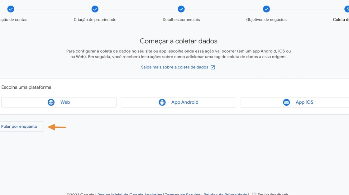 - Escolha a ação que vai ocorrer a coleta de dados ou clique em "Pular por enquanto".