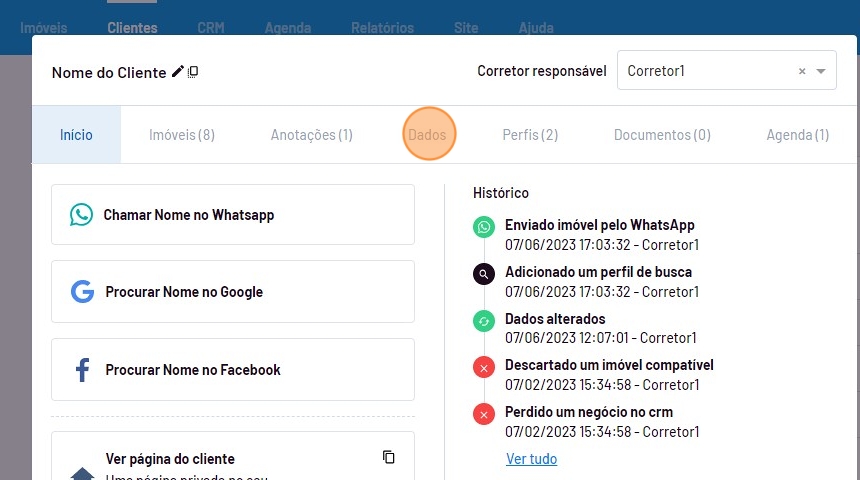 Após abrir a ficha do cliente, clique em "Dados".