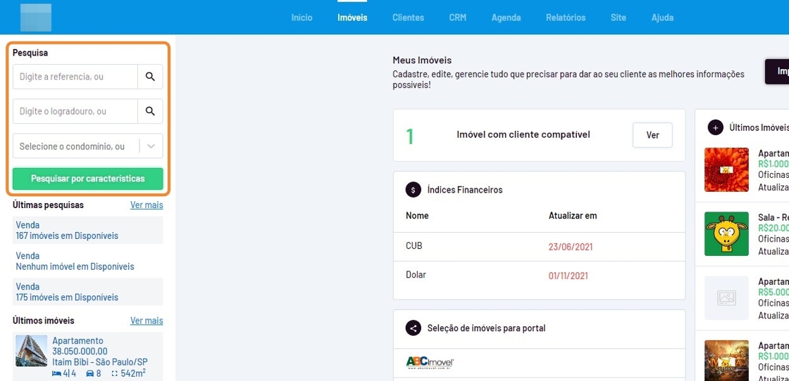 - Utilize o menu do canto esquerdo e pesquise pelos imóveis desejados por "Código de referência" OU por "Logradouro" OU por "Condomínio" OU por "Características".