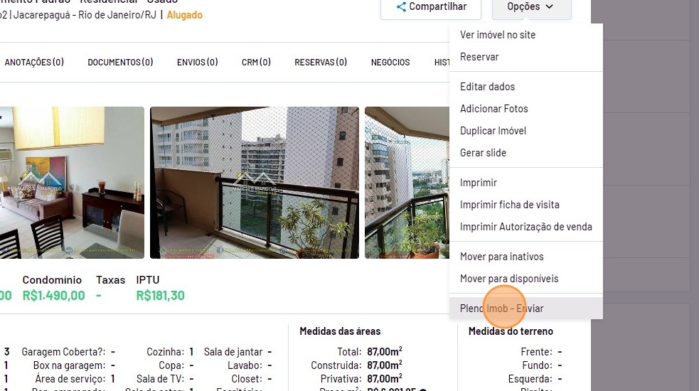 Na ficha do imóvel, passe o mouse em "Opções" e clique em "Pleno Imob - Enviar".