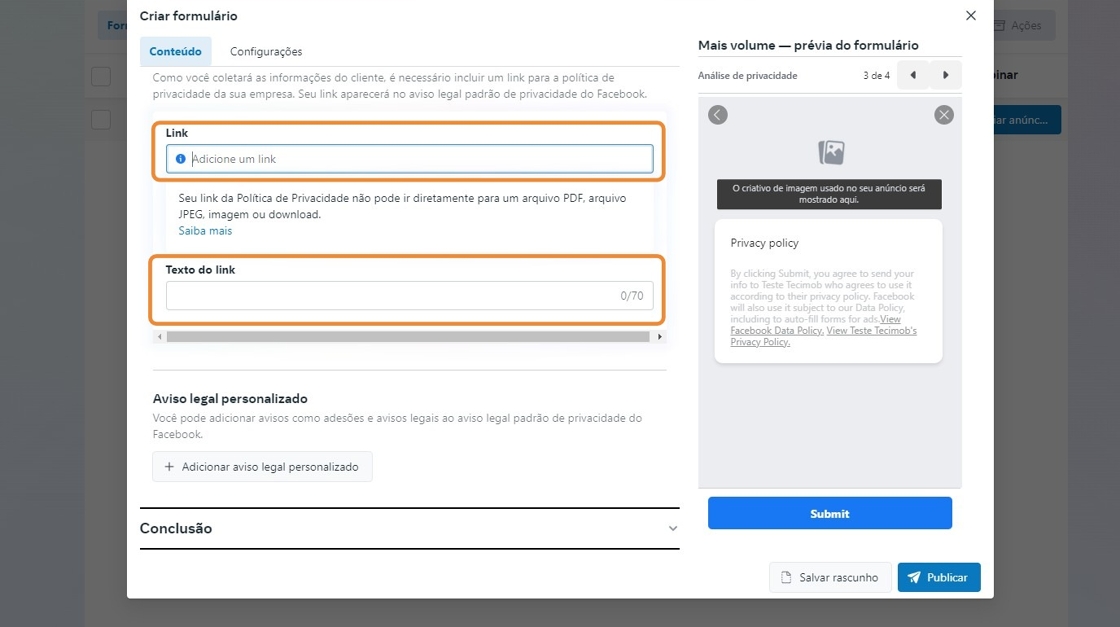 - Insira o link da sua página de "Política de Privacidade" e o texto complementar.