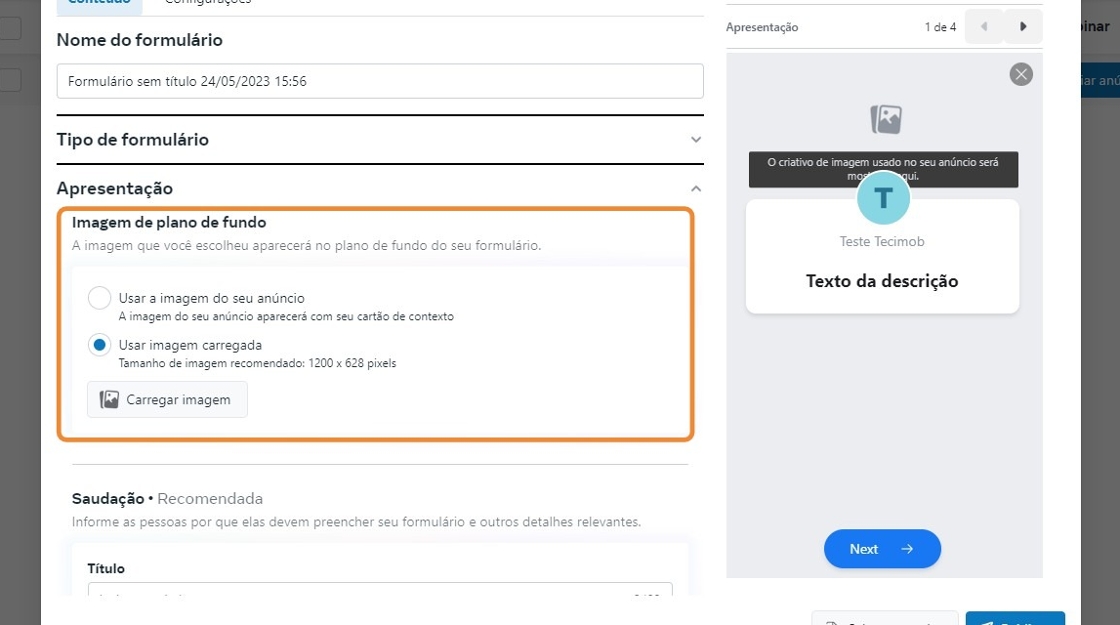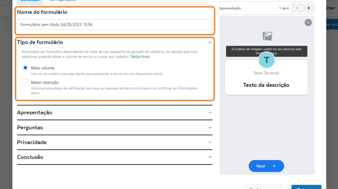 Para criar formulário no Facebook, siga estes passos: