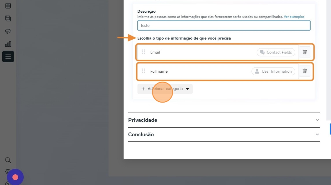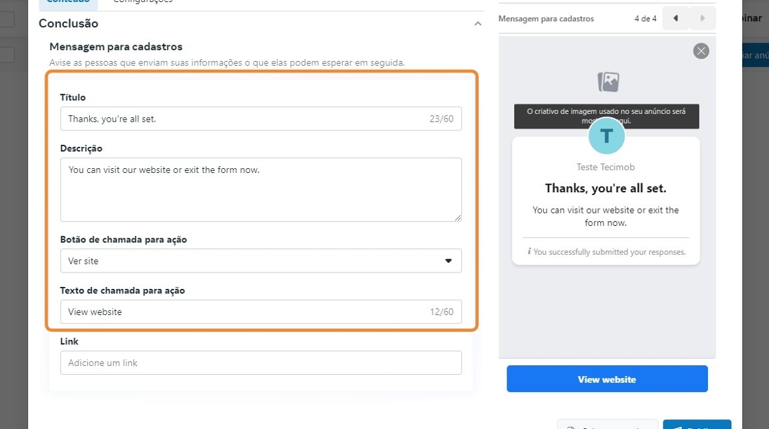- Clique em "Conclusão" preencha o título, a descrição, o botão com a chamada para ação e o texto de chamada para ação.