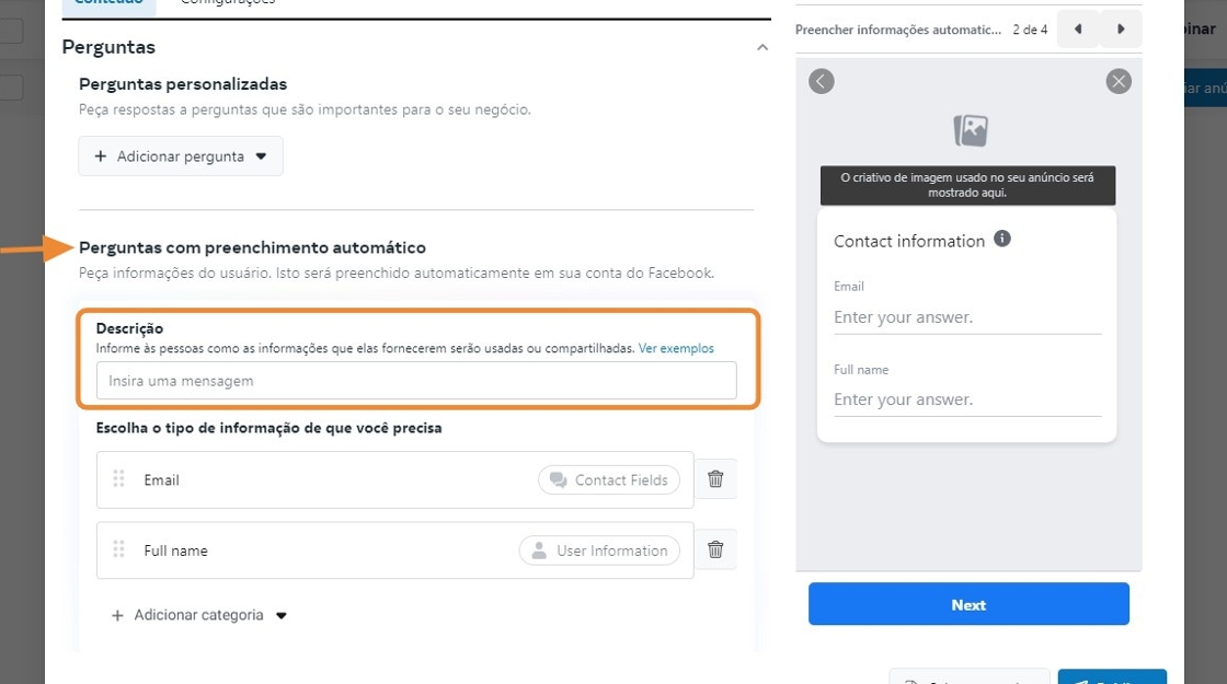 - Em "Perguntas", desça a tela até a a opção "Perguntas com preenchimento automático" e preencha a descrição.