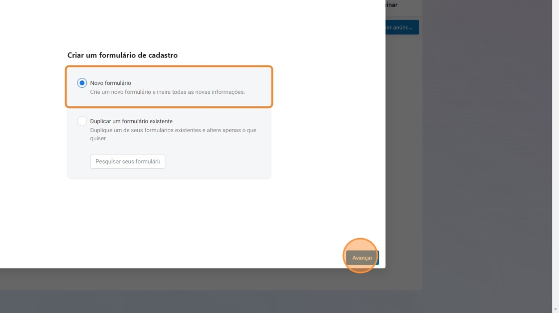- Selecione a opção "Novo Formulário" e clique em "Avançar".