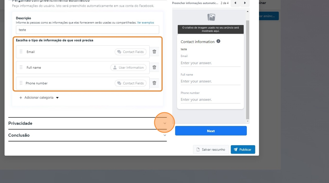 - Com as 3 opções adicionadas, clique em "Privacidade".