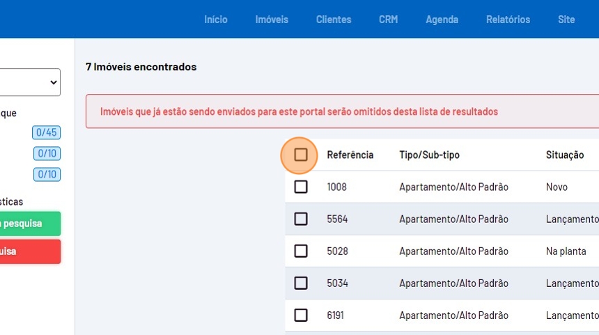 - Clique sobre a primeira caixinha de seleção para selecionar todos os imóveis ao mesmo tempo ou selecione um a um.