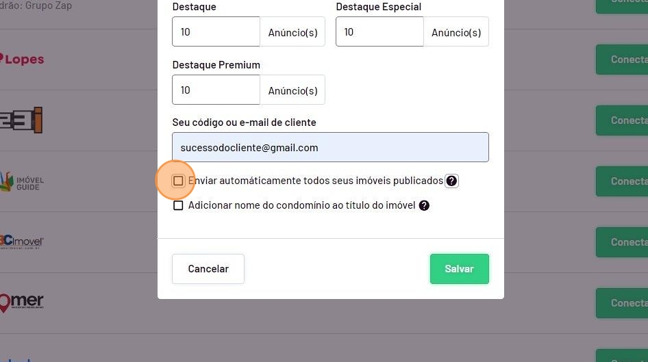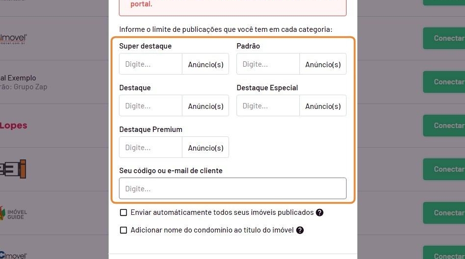 - A opção "Enviar automaticamente todos os seus imóveis publicados" é recomendada para clientes que utilizam portais sem limite de anúncios.