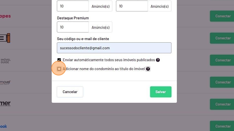 - Ao selecionar a opção "Adicionar nome do condomínio ao título do imóvel", o nome do condomínio será automaticamente adicionado no título do anúncio quando o imóvel for enviado para o portal.