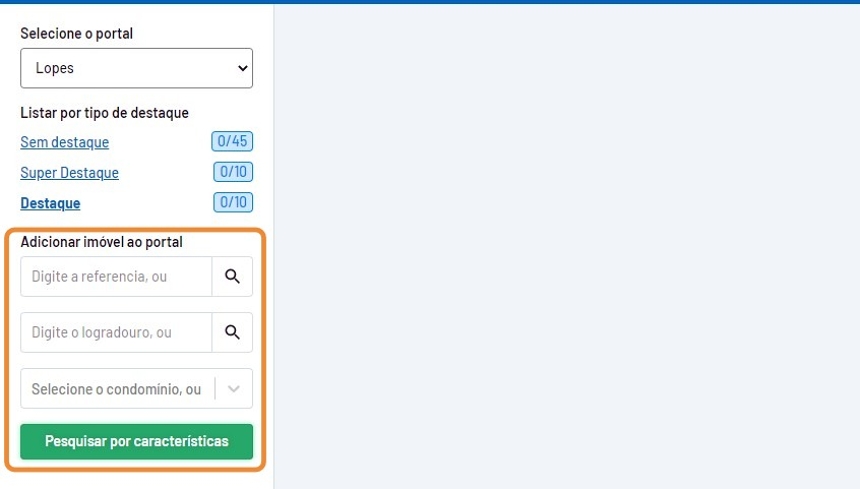 - Encontre seus imóveis por código de referência, logradouro, condomínio ou "Pesquisar por características" para realizar um filtro.