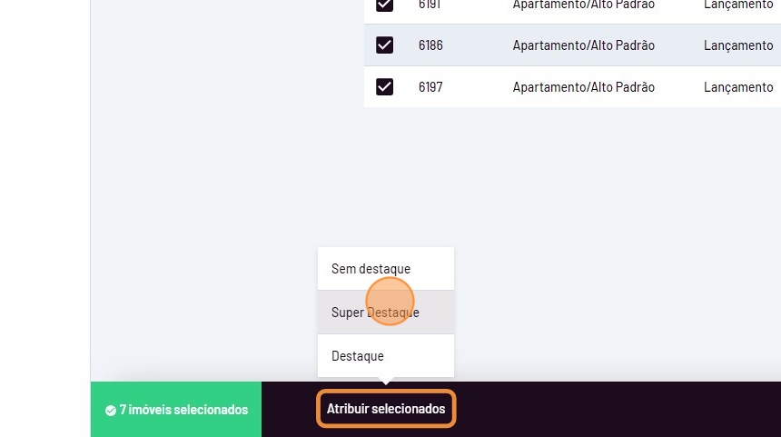 - Passe o mouse sobre "Atribuir selecionados" e selecione o tipo de publicação que deseja publicar os imóveis.