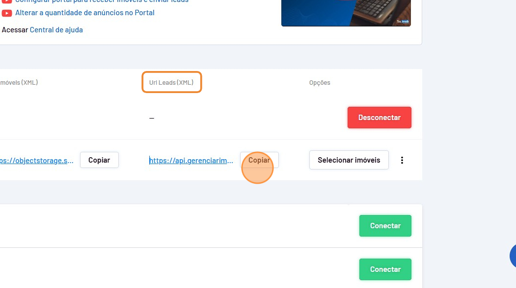 Para copiar a URL dos imóveis e leads para integrar com os portais no sistema Tecimob, siga esses passos: