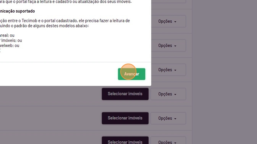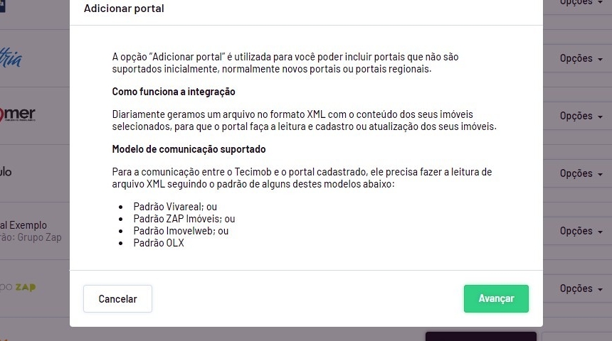 Alerta: O "Modelo de comunicação suportado" é o modelo de arquivo que o Tecimob gera para os portais.
