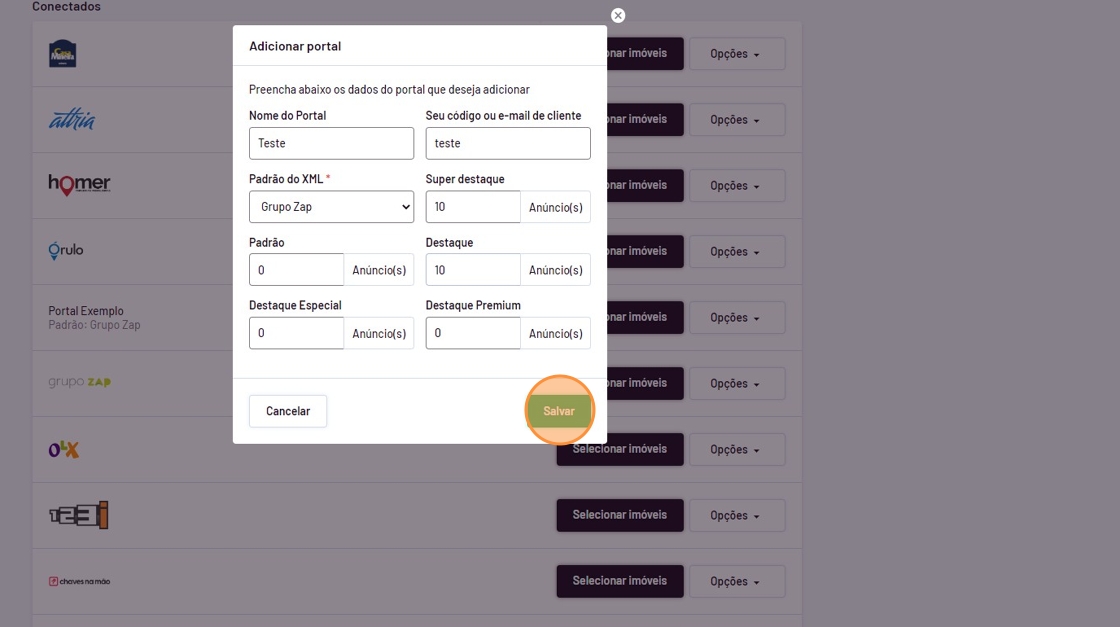 - Insira a quantidade de anúncios que você possui disponível no portal e clique em "Salvar".