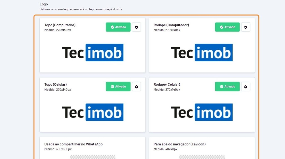 - Defina como seu logo aparecerá no topo, rodapé, ao compartilhar no Whatsapp e na aba do navagedor (Favicon).