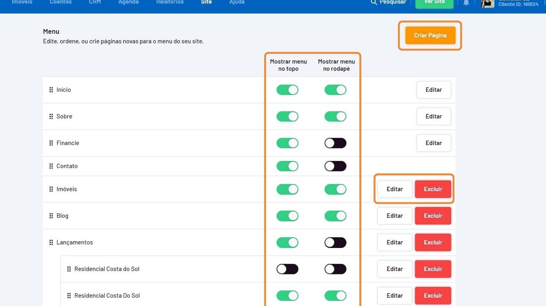 - Defina os menus que irão aparecer no topo e rodapé do site, edite ou exclua um menu e crie novos menus clicando em "Criar página".
