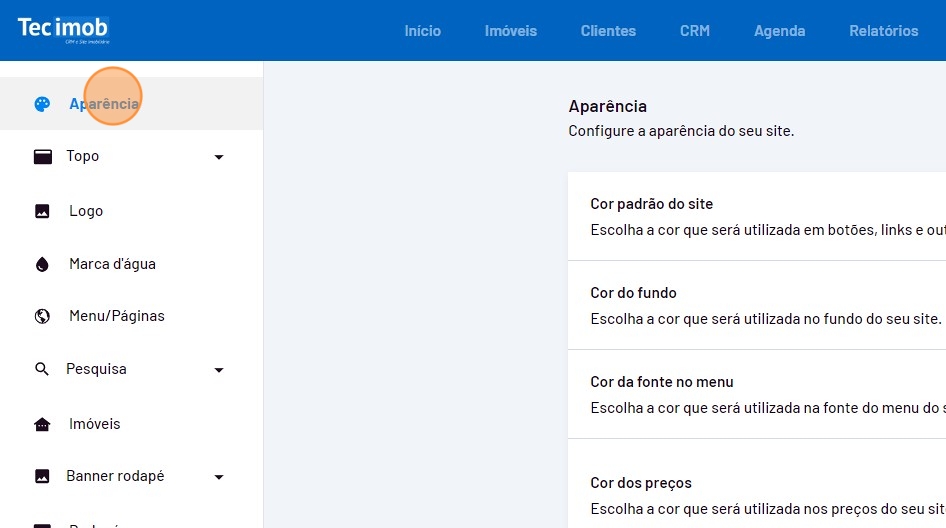 - Na barra lateral, é possível visualizar os locais do seu site para personalizar de forma manual, a primeira opção é "Aparência".