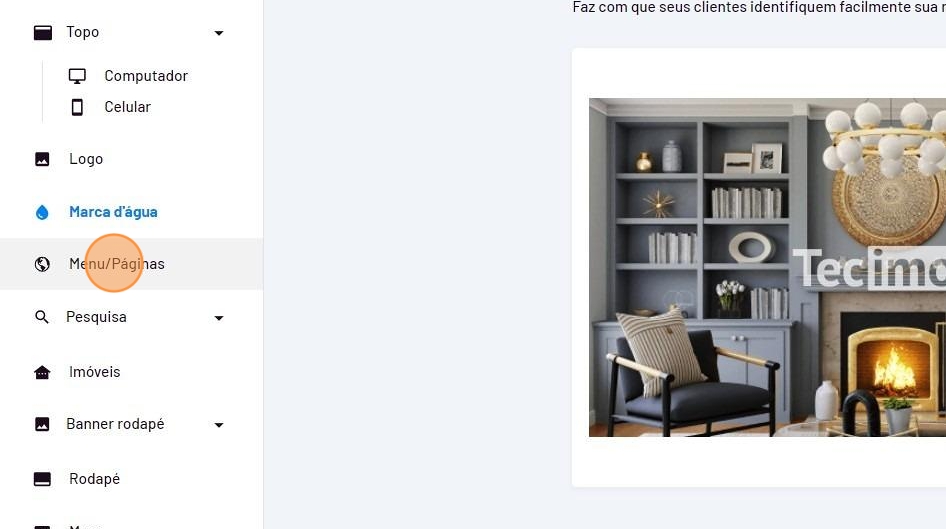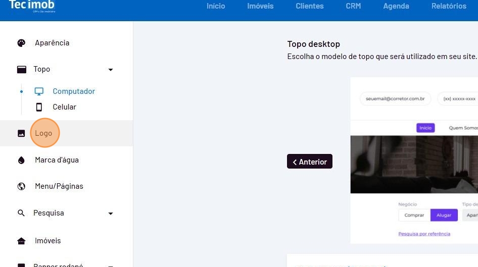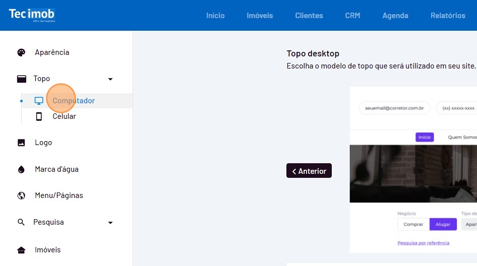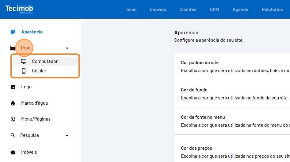 - Clique em "Topo" e selecione a opção "Computador" ou "Celular" para realizar as alterações.