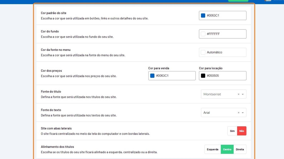 - Em aparência, é possível definir as cores, fontes, abas laterais e alinhamento dos títulos.